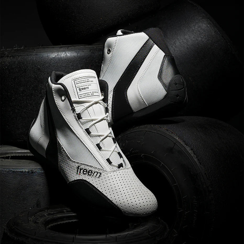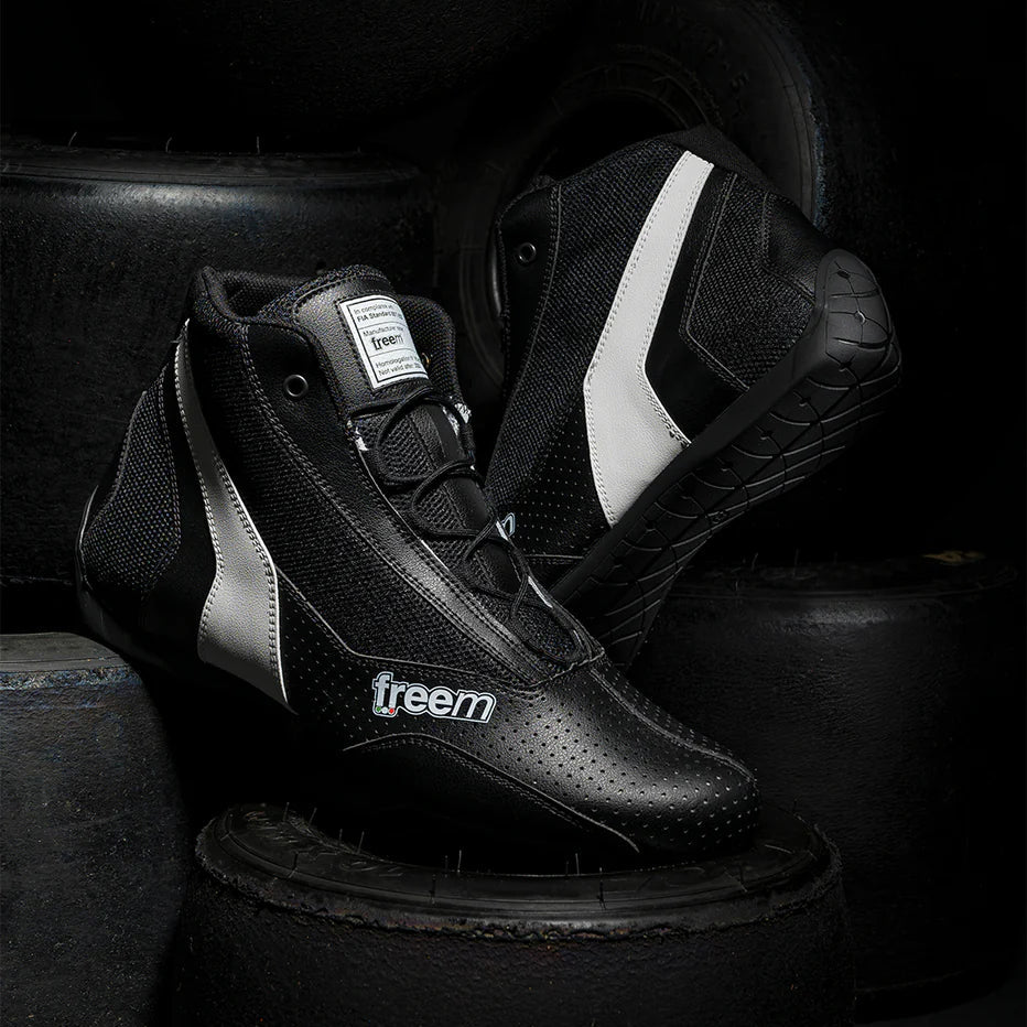 The Freem® SK24 Kart Shoe is meticulously engineered to meet the demands of competitive racing. Crafted in Italy, this shoe seamlessly blends advanced materials with an ergonomic design to deliver exceptional on-track performance. The upper, constructed from durable, holed synthetic leather and breathable mesh inserts, ensures optimal ventilation. Inside, the ergonomic fit provides unparalleled comfort and a precise pedal feel. A specially designed oil-resistant sole guarantees superior grip and durability, while full compliance with the FIA 8877-2022 standard ensures the highest level of safety and fire-retardant protection.