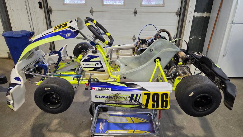 Ready to race 2025 CompKart 4R-25 4 cycle chassis with strong, sealed one-season refreshed 2024 Briggs & Stratton LO206 engine. Verified straight on chassis table. Compkart #2 seat currently installed. Available as a roller as well! (Engine hour meter pictured at 23:09)